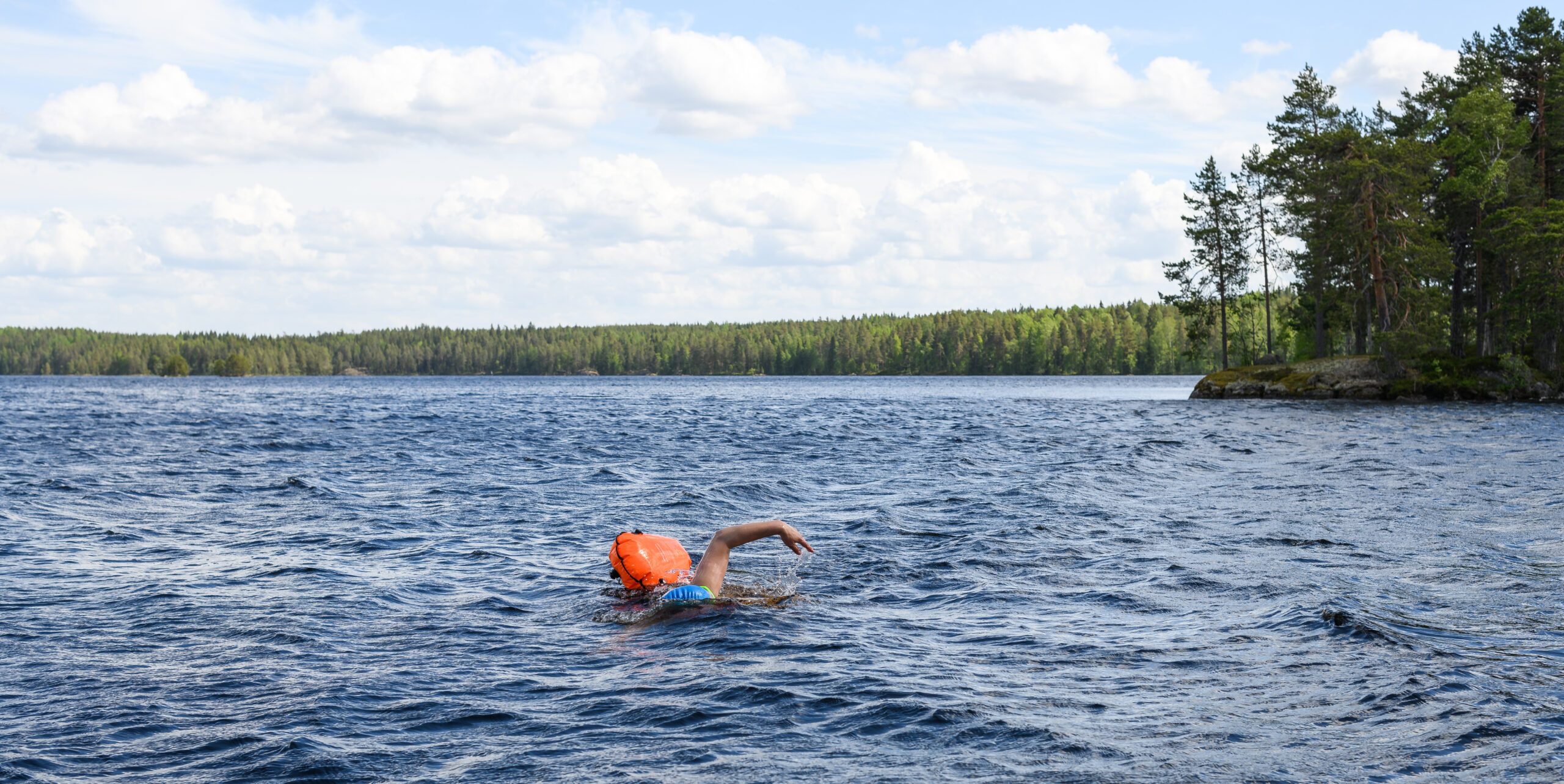 Uimari järvellä, oranssi uimarinpoiju perässä.